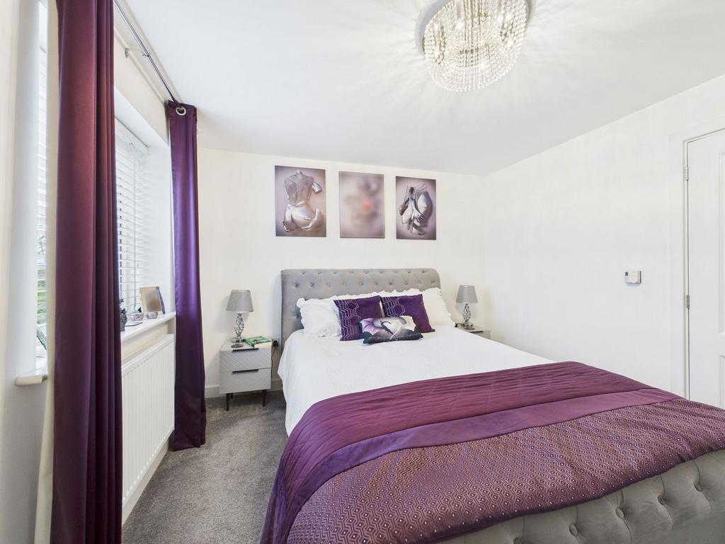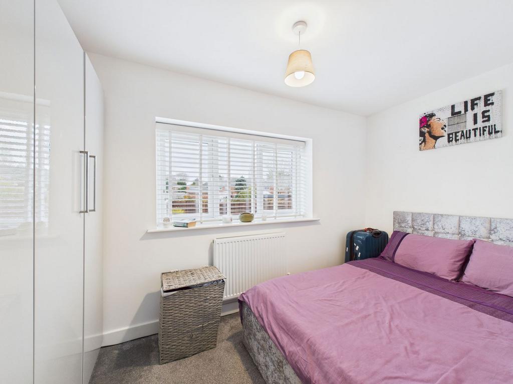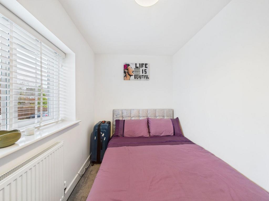 Upstairs, the property offers two generous double bedrooms, with the second bedroom featuring fitted wardrobes for convenient storage. Completing the first floor is a modern family bathroom, decorated in neutral tiles and fitted with a bath with overhead shower and glass screen, WC, and pedestal sink.