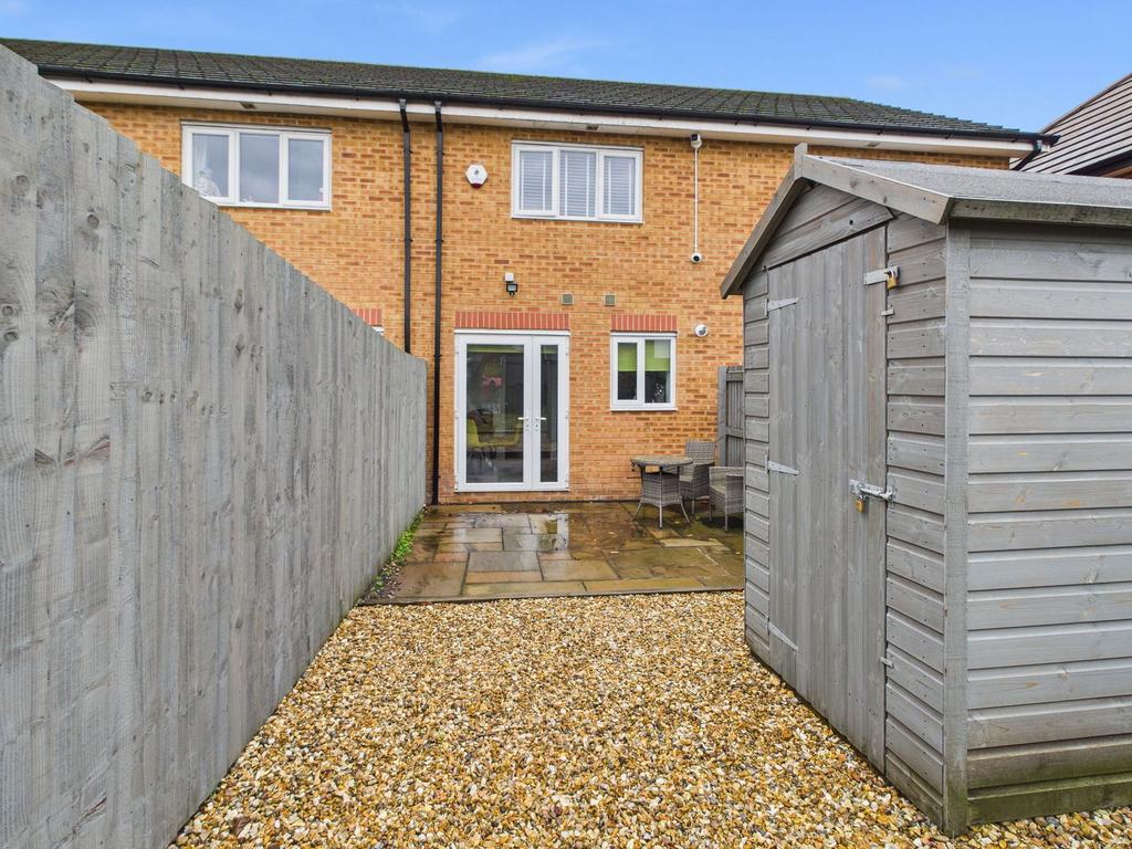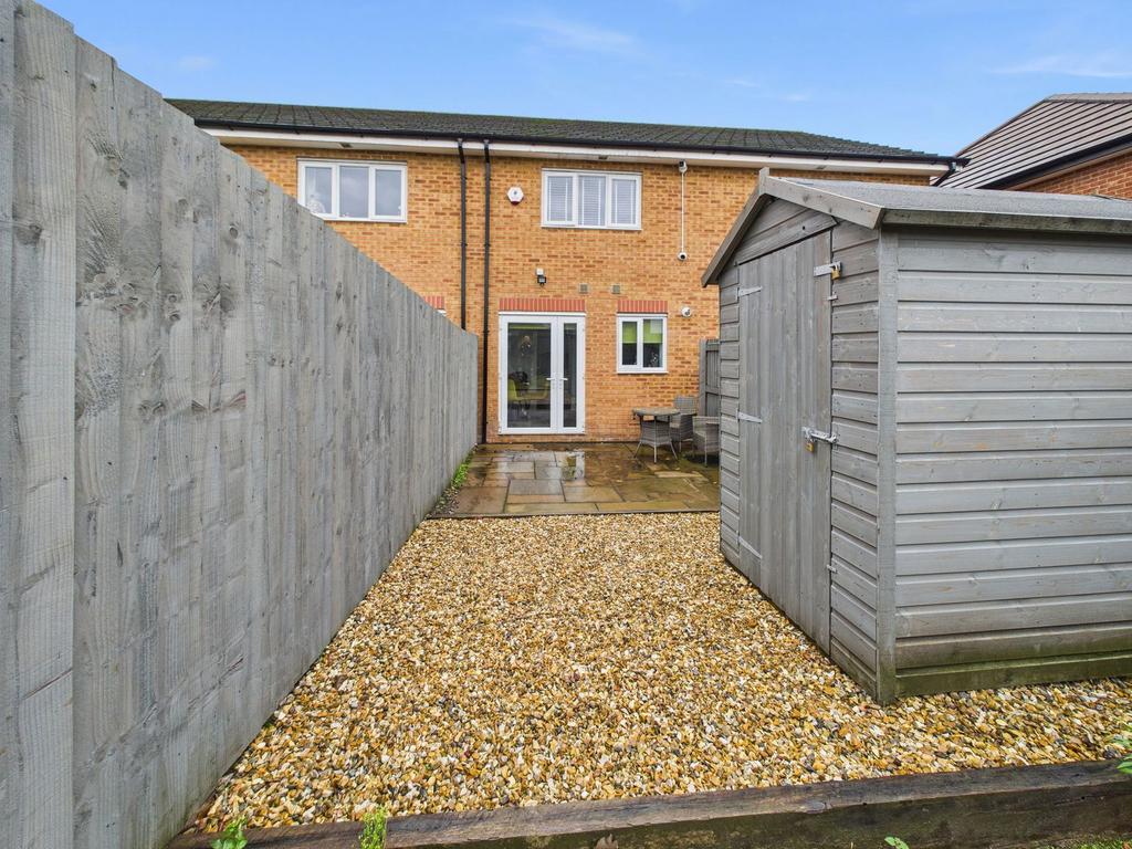 Outside, the property benefits from a private rear garden featuring a paved patio area, a stoned section, and a garden shed, offering a great space for outdoor relaxation or entertaining. To the front of the property, there is a well-maintained lawn and a pathway leading to the entrance, with on-street parking available.