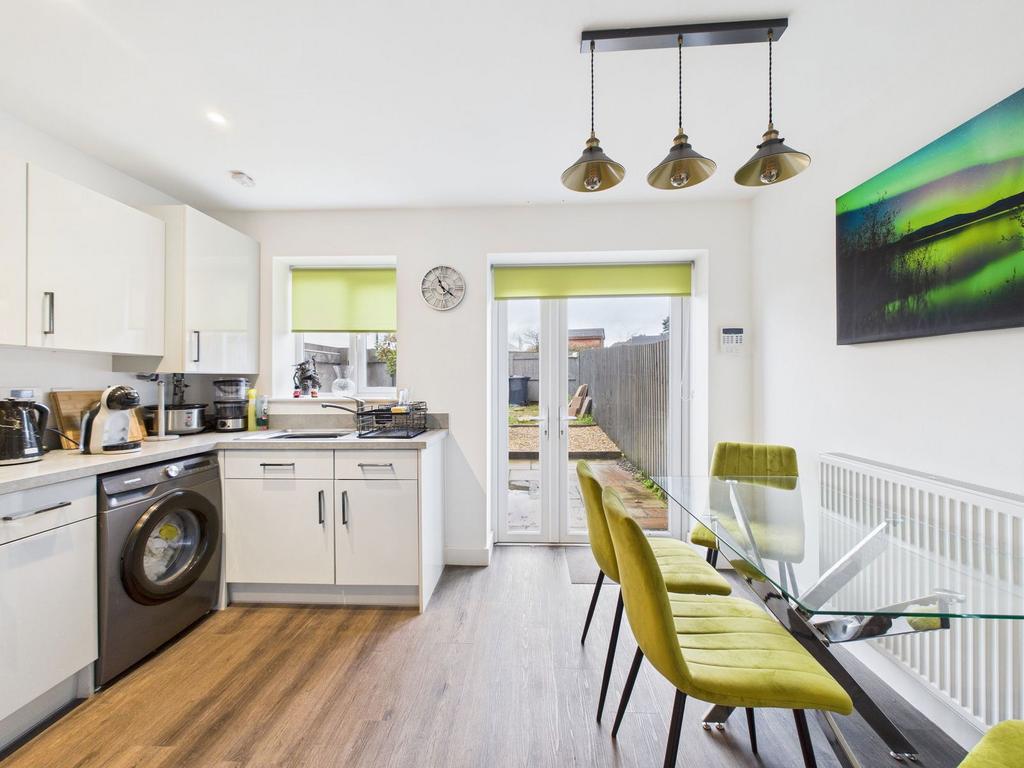 Continuing through to the rear of the property, you’ll find a spacious kitchen/dining area fitted with matching white wall and base units, complemented by grey worktops for a modern finish. The kitchen is complete with an oven, gas hob, extractor fan, stainless steel sink, washing machine, and freestanding fridge freezer. There is ample space for a generous dining table, perfect for entertaining or family meals, and French doors open directly onto the rear garden, creating a lovely flow between indoor and outdoor living.