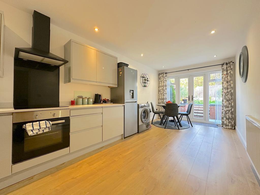 Internally, the property features a welcoming entrance hall with useful storage and access to the roof space. The spacious lounge offers a relaxing setting filled with natural light, while the modern fitted kitchen and dining area provides a practical and stylish space for everyday living, complete with integrated cooking appliances, ample storage, and French doors leading directly to the rear garden.