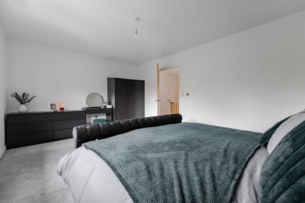 Upstairs, the first-floor landing leads to two generous double bedrooms, each with fitted carpet, radiators, and double-glazed windows. The principal bedroom overlooks the rear garden, while the second enjoys views to the front. The family bathroom is finished to a high standard, featuring a three-piece white suite with a panelled bath and overhead shower, vanity-style wash basin, and low-level WC, complete with tiled splashbacks and vinyl flooring.