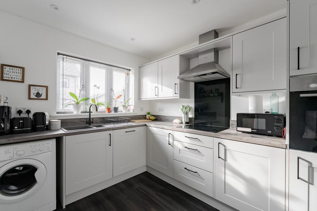 Guide Price: £250,000 - £270,000. Designed for modern living and finished to a high standard throughout, this beautifully presented terraced home offers a stylish and practical layout ideal for first-time buyers. The entrance hall introduces a bright and welcoming tone with access to a sleek WC fitted with a contemporary suite. The high-specification kitchen and dining area feature matching fitted units, integrated appliances, and a wide front-facing window that brings in natural light, flowing effortlessly into a generous lounge warmed by underfloor heating and framed by French doors that open to the garden. Upstairs, two spacious double bedrooms are complemented by a modern family bathroom complete with a three-piece suite and vanity storage. Outside, the enclosed rear garden combines a paved patio with artificial lawn for easy upkeep, while to the front, a private driveway provides off-road parking for two vehicles, completing this premium home in a peaceful, well-connected setting.