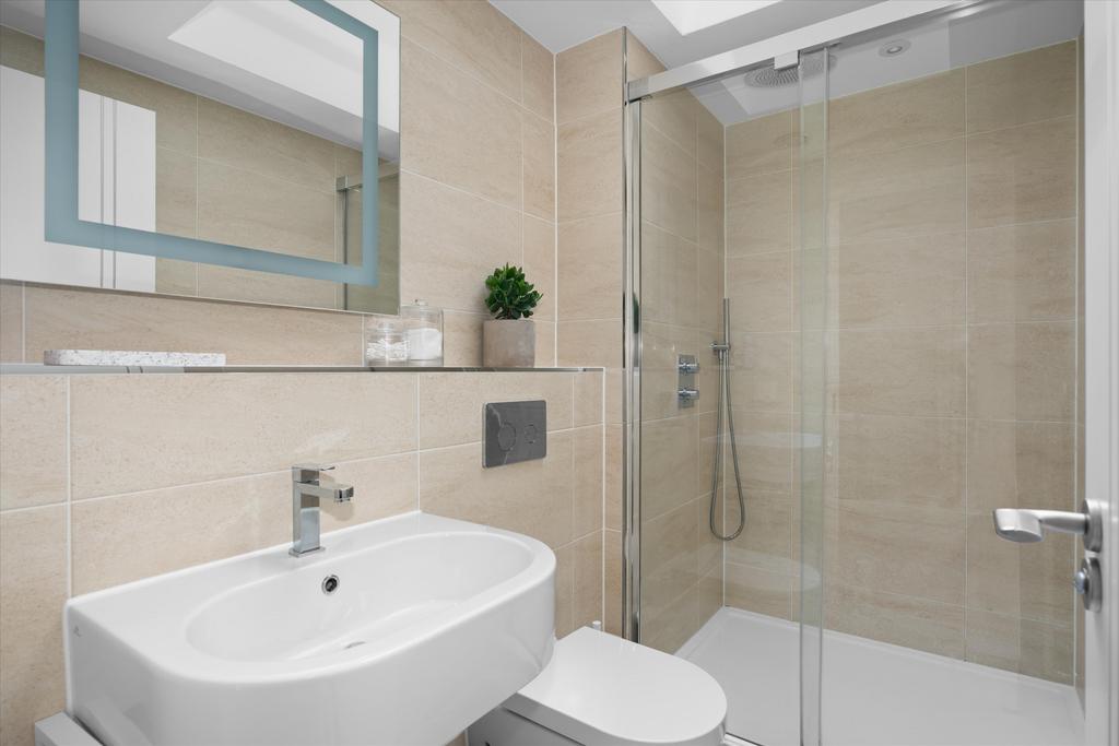 A generous entrance hall leads to a central first-floor landing, opening into a beautifully bright, triple-aspect living space spanning almost 23ft. Designed to maximise natural light, the room enjoys a vaulted ceiling, floor-to-ceiling windows and French doors leading directly to the terrace.