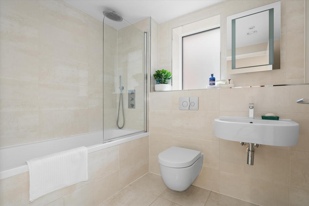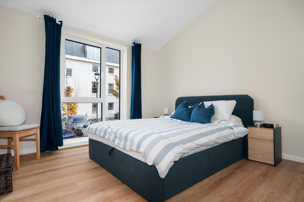 The principal bedroom offers excellent proportions, with a dressing area, built-in wardrobes and a luxurious en suite. Two further double bedrooms also feature floor-to-ceiling windows, with bedroom two benefiting from its own en suite.