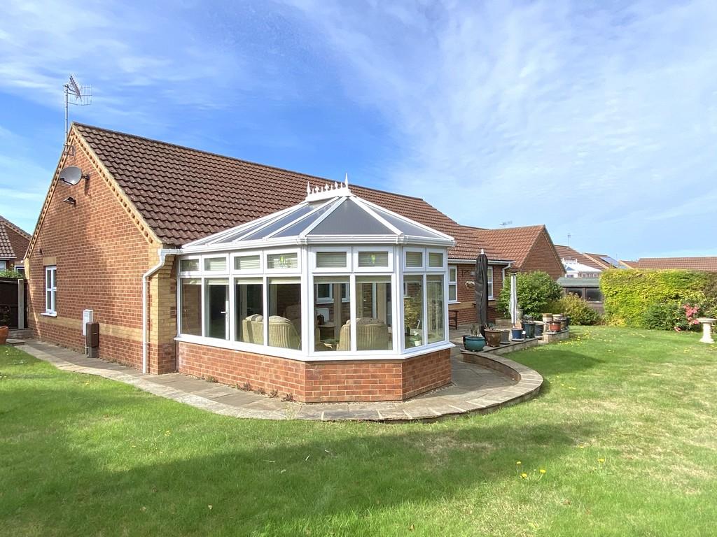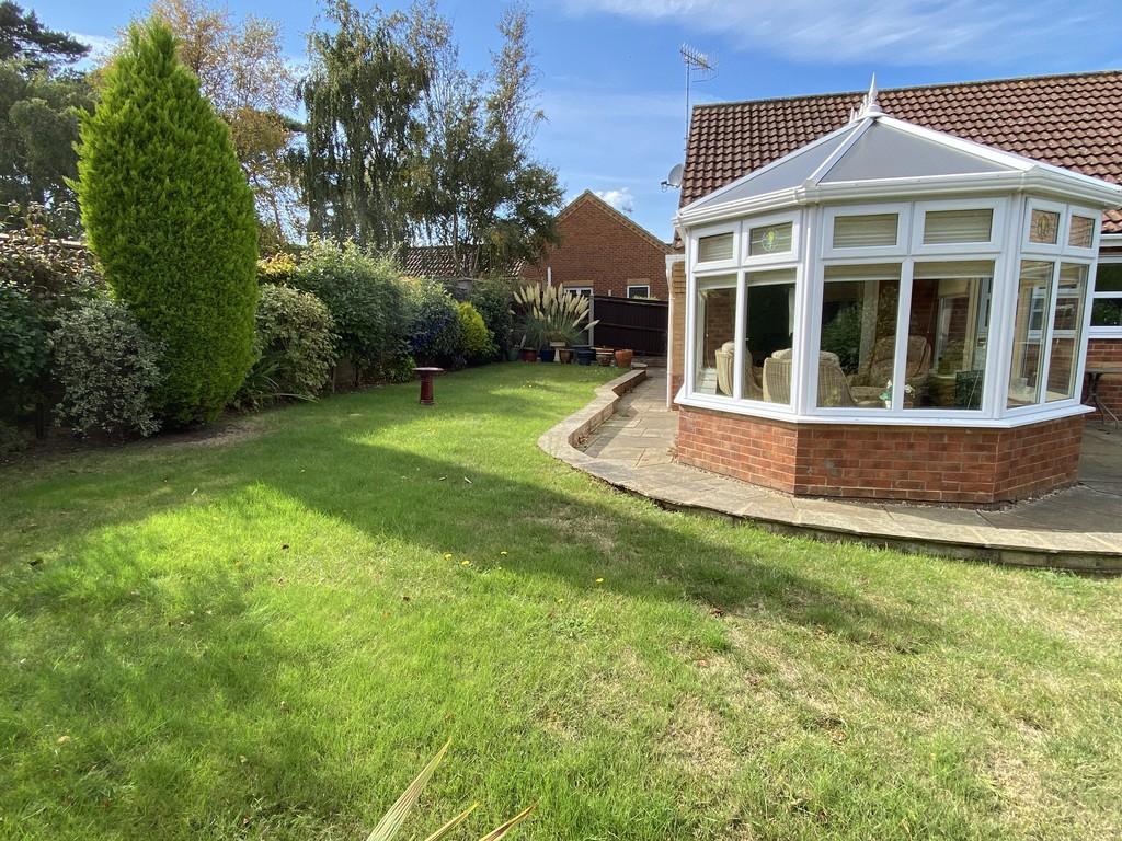 The front garden of the property is landscaped with ease of maintenance in mind, with a brick weave path, edged by shingle beds and borders planted with mature, neatly tended shrubs and topiary. A tall gate at the side of the property gives access to the rear garden, this enjoys an easterly aspect, is fully enclosed by timber fencing and is beautifully landscaped. Immediately to the rear of the bungalow is a large sandstone patio with outside tap. This leads onto a lawn which sweeps along the West and South sides of the property and is edged by borders planted with a wealth of beautiful shrubs and flowers for year long colour and interest. Steps from the patio lead down to the rear of the garage which is screened from the main garden and provides a useful storage area with a hardstanding on which are two timber sheds.