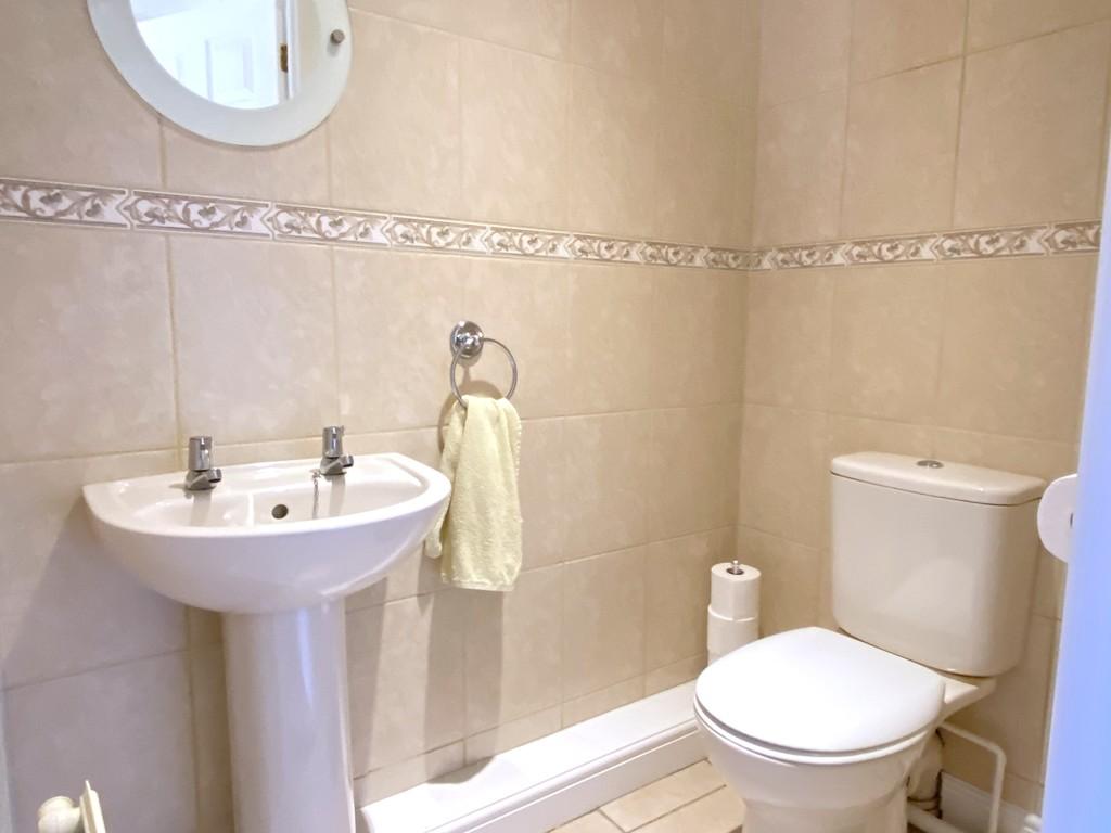 Cloakroom 5' 2" x 3' 6" (1.57m x 1.07m) Pedestal basin with mixer tap, low level WC, tiled floor, tiled walls, extractor fan, recessed LED spotlights, radiator.