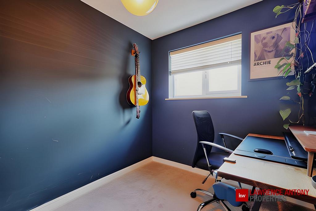 The kitchen continues the modern feel, with stylish fittings and a touch of luxury thanks to its gold-plated tap. There’s space for both a dishwasher and washing machine, plus a fitted oven for everyday ease. The window overlooks the garden, meaning you can keep an eye on the children or enjoy the view of greenery while preparing dinner.