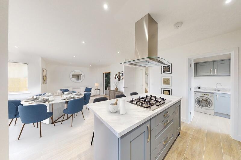Featuring a stylish yet classic open plan kitchen/dining room designed by Symphony, featuring the Woodbury range with laminate worktops, glass splashbacks, Blanco sink & taps and a removable unit to make space for an optional washing machine along with double oven, a five burner hob, extractor hood and integrated fridge/freezer. Including French doors offering access to full turfed garden/patio area. The kitchen/dining/family area also has the added feature of a sizeable utility room.