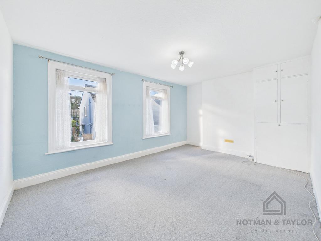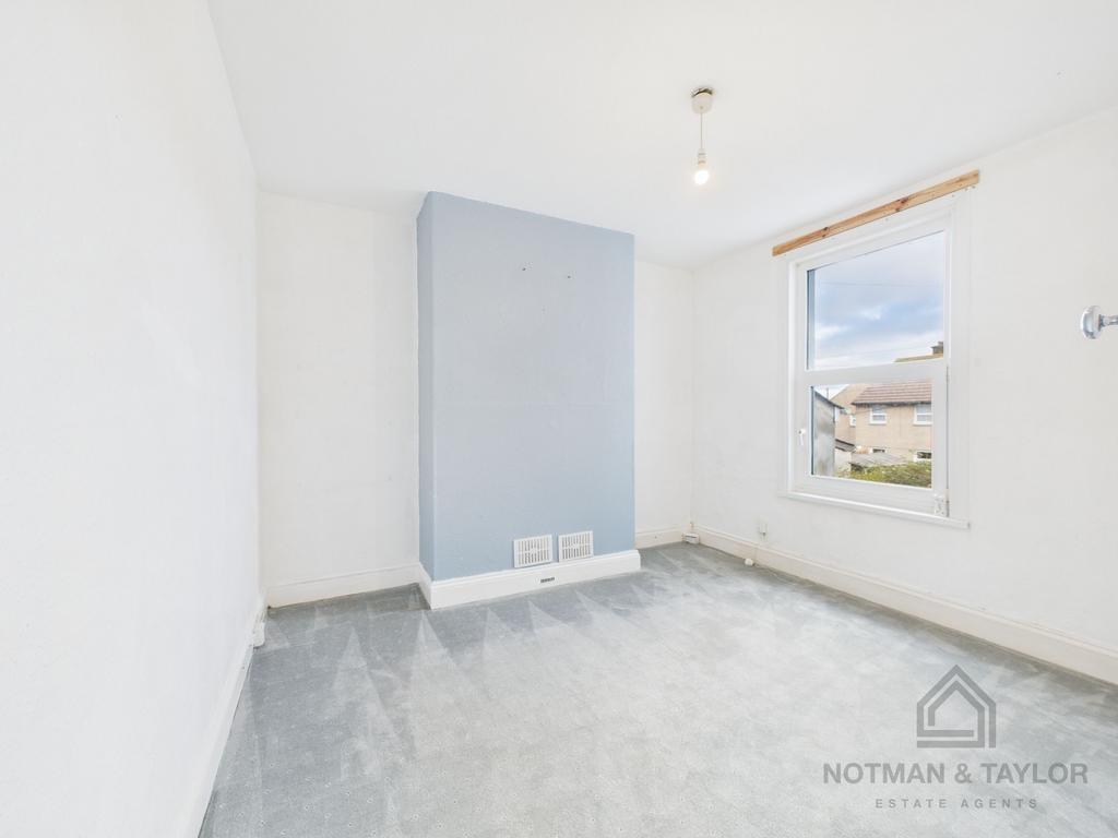 Upstairs, the landing leads to two well-proportioned double bedrooms, both filled with natural light. The generous front bedroom spans the width of the house and includes twin windows, while the second bedroom enjoys pleasant garden views. The family bathroom is spacious and fitted with a white suite and cheerful blue-and-white tiling.