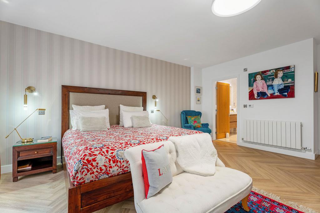 The spacious master bedroom features built in bespoke hand painted Stan Mathews wardrobes and a large fully tiled ensuite with Anderson white polished porcelain, featuring Porcelanosa Krion one, his and hers washbasin and vanity units, jacuzzi bath and separate glass enclosed shower with Porcelanosa Attica and Grohe and Hansgrohe hardwear.