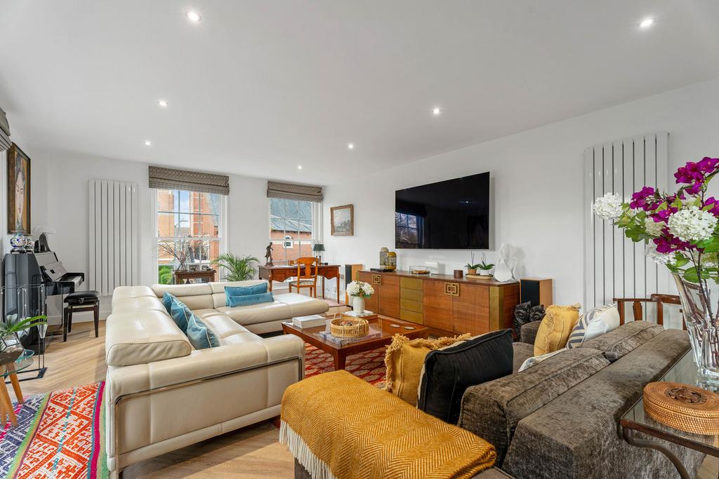 The spacious open plan living area is flooded with light from large, dual aspect, sash windows offering views over the Pump room gardens to the River Leam. The stunning high gloss, handleless kitchen features a large Swinsons quartz central island with seating for four, Nile Calacatta Viola Worktops, and all the integrated appliances you would expect from a modern family kitchen, including Neff oven, Siemens induction hob, integrated dishwasher, fridge freezer and wine fridge.
