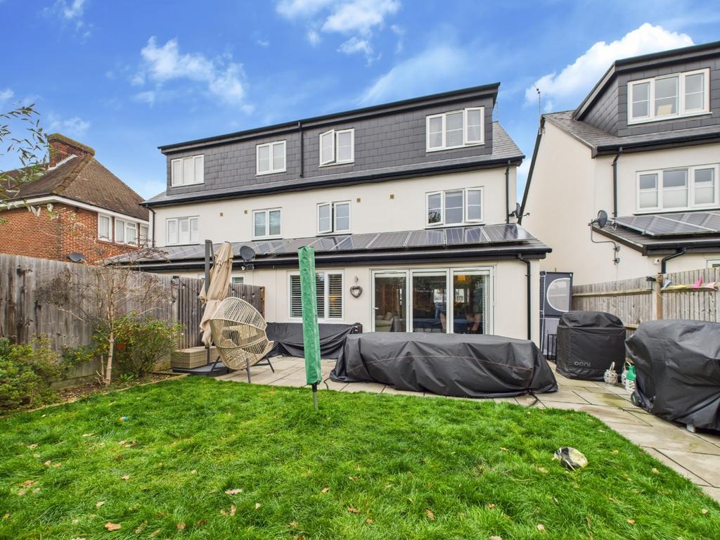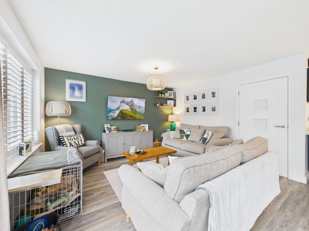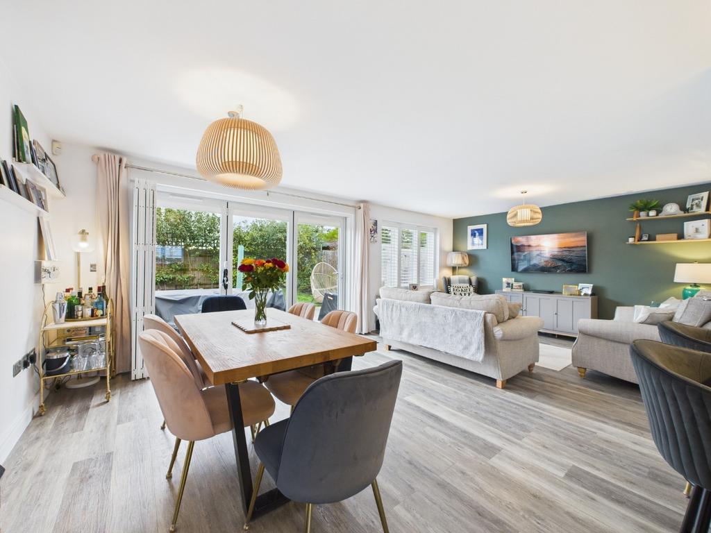 To the rear, a south-facing garden with a mix of lawn and patio makes for a fantastic outdoor space, ideal for family life or entertaining. Complete with bi-folding doors from the living room, providing a seamless transition from inside to outside. At the front, the driveway offers off-street parking for two cars.