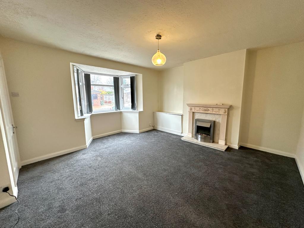 Living room with a feature fireplace, double glazed window to the front of the property and carpet flooring.