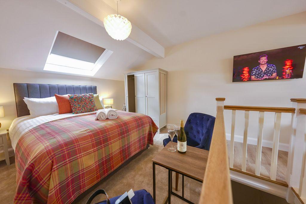 This beautiful duplex suite is arranged over the first and second floors. Enter through your private hallway from the first-floor landing, where you'll find a luxury bathroom with a separate bath and rain shower, a modern vanity unit, and a WC.