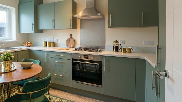 Off the hallway, the kitchen is fitted with stylish base and wall units, an integrated oven and hob, and an extractor fan. A sleek stainless steel sink and drainer sit beneath the front-facing window. There's also ample space for your fridge/freezer and washer dryer.