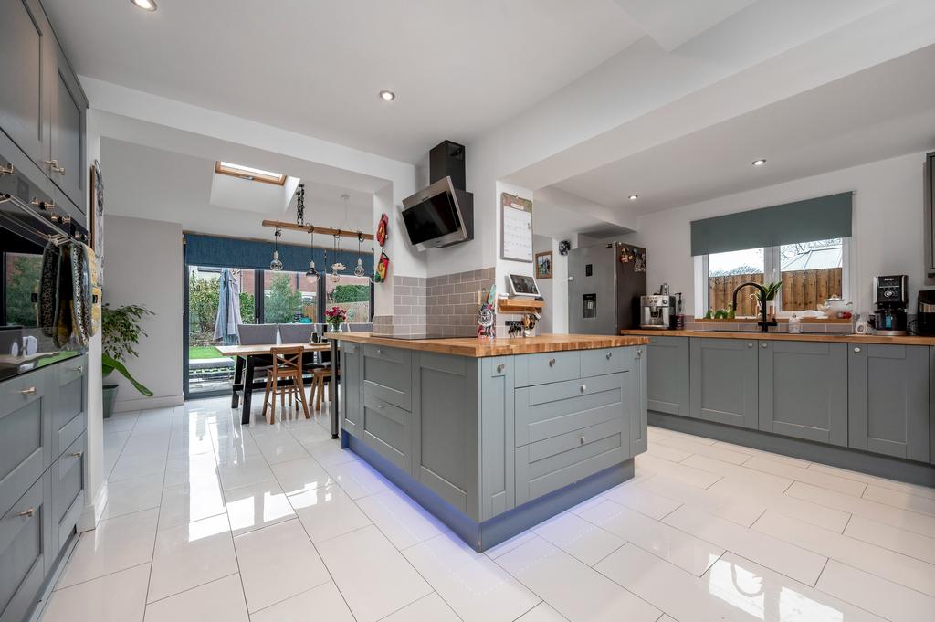 A cosy snug or playroom sits just off the lounge, providing a great space for children or relaxation, while a front-facing home office offers privacy for remote working. The impressive open-plan kitchen is a true showstopper, designed for both everyday living and entertaining. Distinct areas for cooking, dining, and relaxing are enhanced by roof lights that flood the space with natural light. A second woodburning stove adds warmth and character, while additional bifold doors extend the space into the beautifully landscaped garden. The kitchen is finished to a superb standard, featuring high-end Smeg appliances, oak worktops and extensive storage. A practical utility room provides further storage along with a WC, sink, and space for laundry appliances.