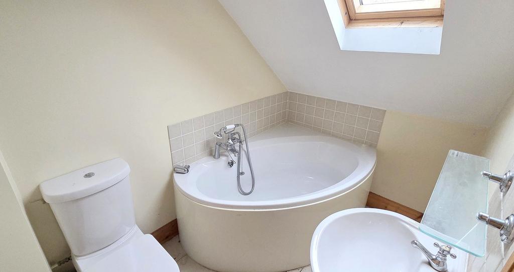 Landing door: Inner Lobby with eave storage and stairs to top floor. Family Bathroom fitted white suite, shaped corner bath, low level WC, wash basin and front Velux.