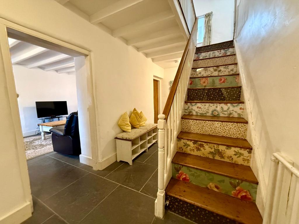 Door to front, stairs to first floor landing, exposed beams, slate flooring with underfloor heating, understairs storage cupboard and further built-in cupboard.