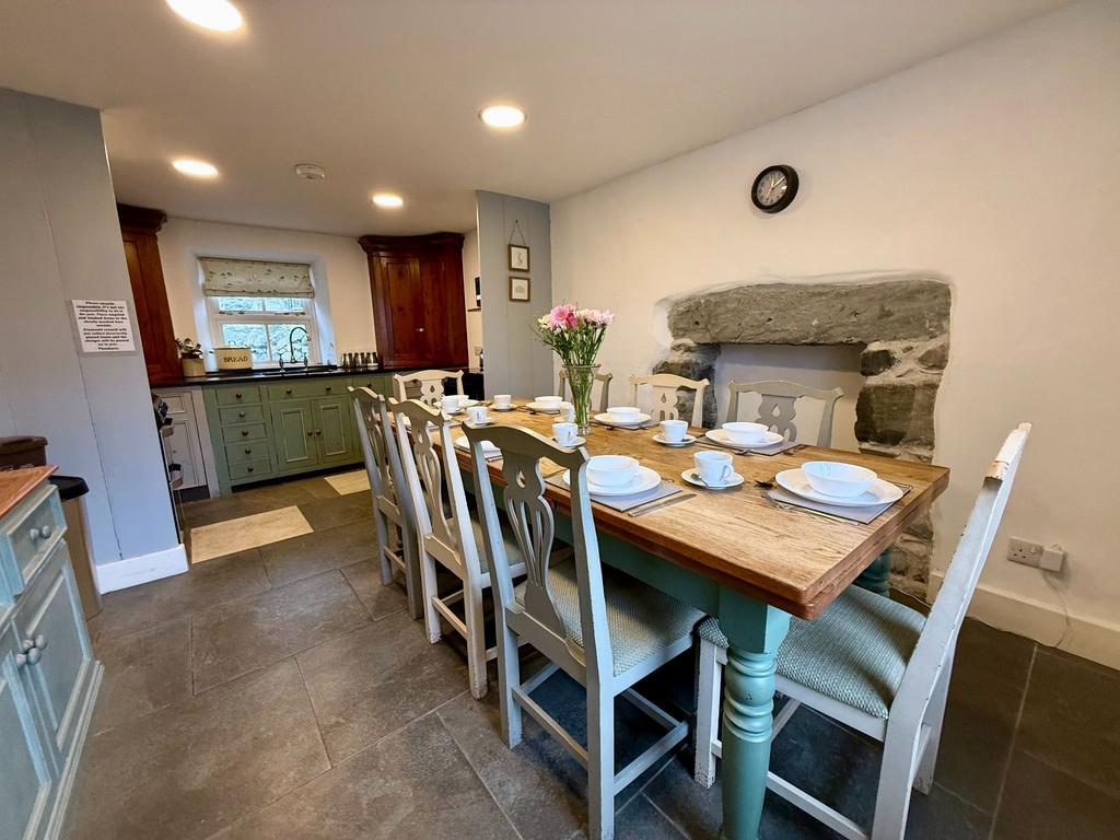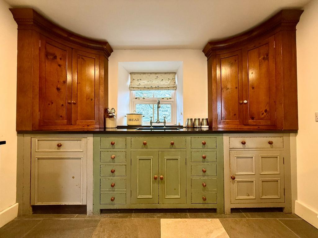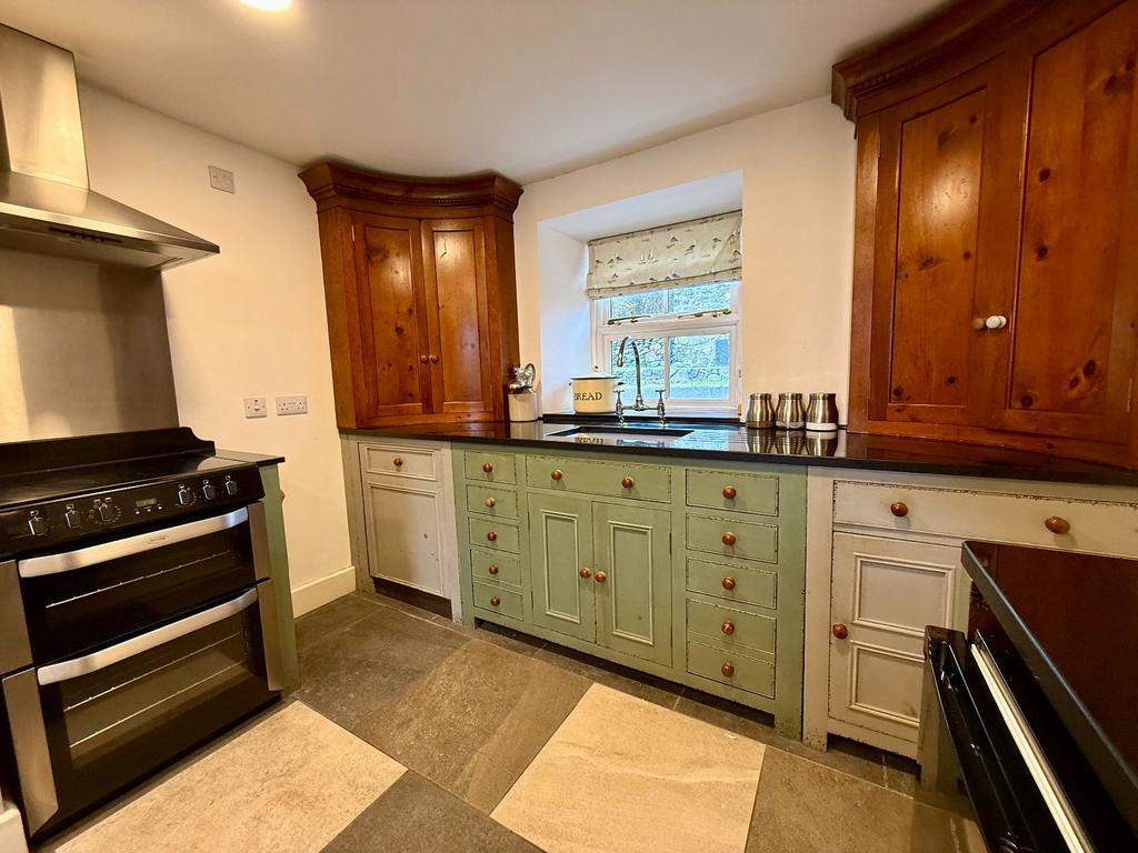 Window to front, window to rear, ceiling downlights, feature stone fireplace. Handmade kitchen comprising 5x base units including dishwasher, space for a fridge and electric cooker with stainless steel extractor hood above, stainless steel splashback, granite worktop with inset Belfast sink, 2x large corner cupboards, tiled flooring with underfloor heating.