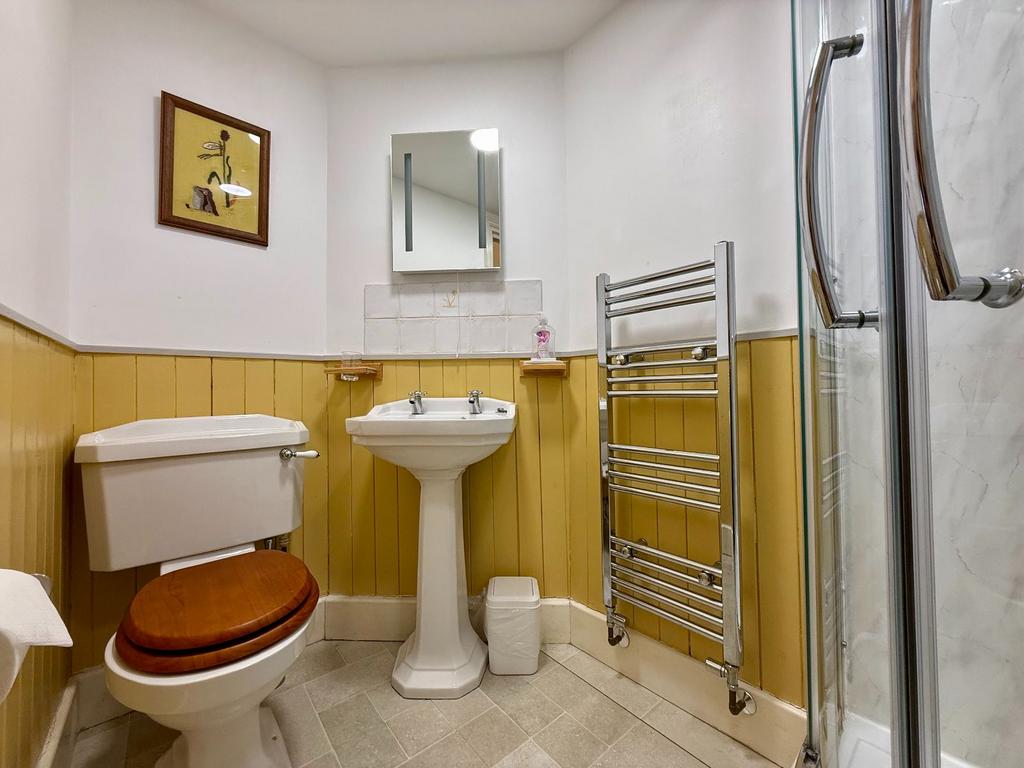 Ceiling downlights, extractor fan, low level W.C., pedestal wash hand basin, shower cubicle with wet wall paneling and mains shower, tongue and groove to dado rail height, illuminated vanity mirror, heated towel rail, cushioned flooring.