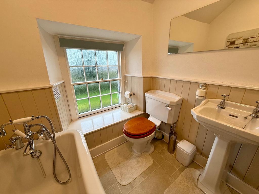 Window to front, ceiling down lights, low level W.C., pedestal wash hand basin, free standing roll top bath, tongue and groove to dado rail height, heated towel rail, cushioned flooring.
