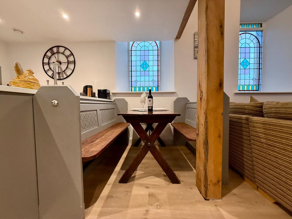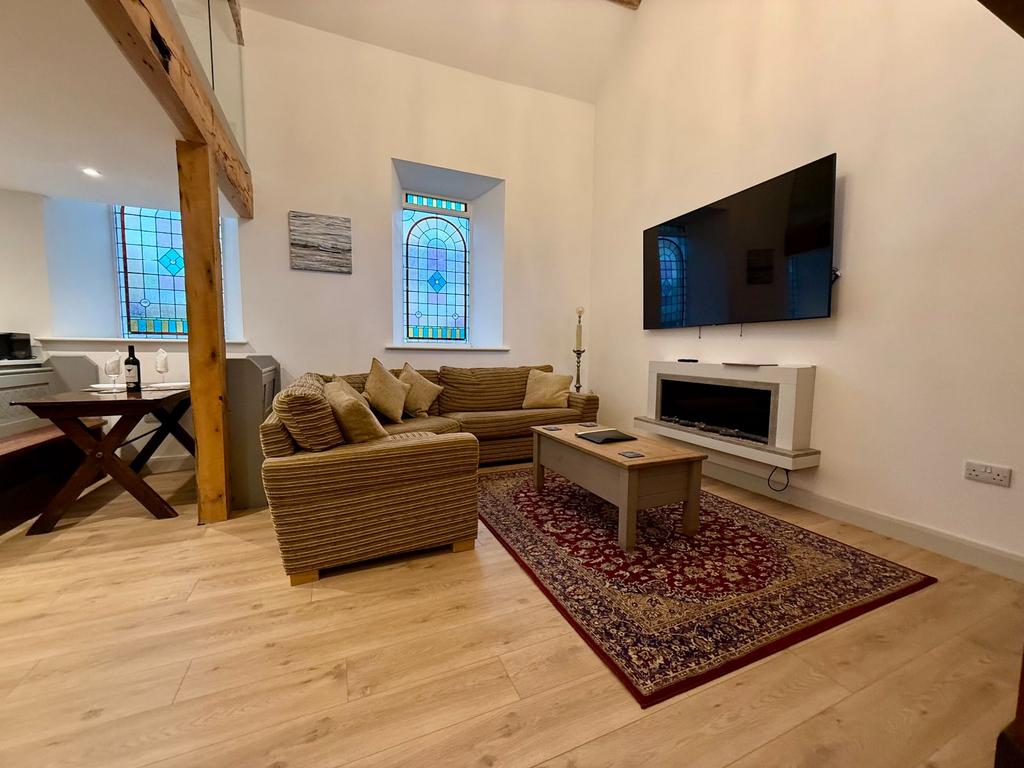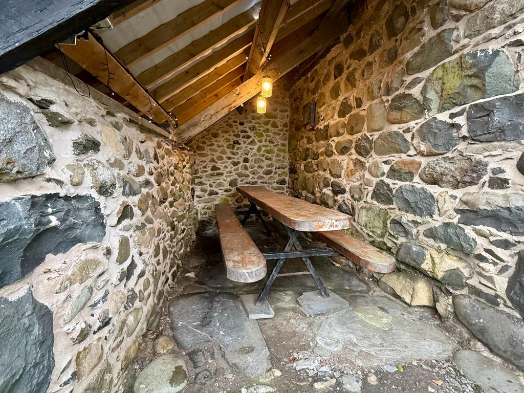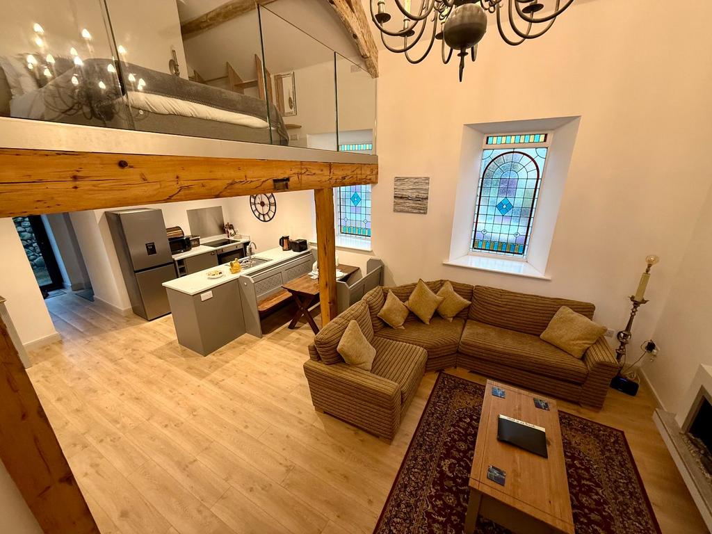 Formerly a chapel, Capel Peniel has undergone an extensive and thoughtful refurbishment to create a stylish one-bedroom holiday let. The property is presented in excellent condition throughout and features an open-plan sitting, dining, and kitchen area, with the original pulpit cleverly repositioned to form a cosy snug/seating space. A mezzanine bedroom with a glass frontage occupies the first floor, with a shower room and WC located discreetly behind the bed.