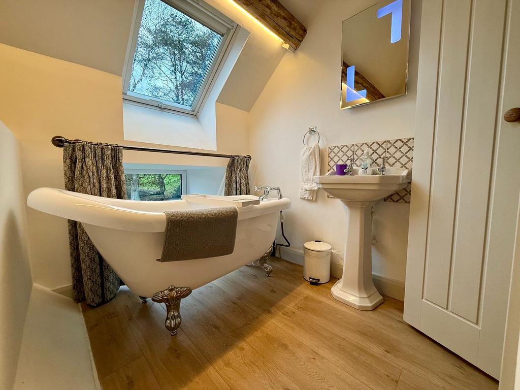 Glazed balustrade overlooking sitting room, beans, Velux to rear, Window to rear, freestanding roll top bath, pedestal wash hand basin with LED mirror over, shower cubicle with mains shower, wet wall paneling, heated towel rail, dressing area, laminate flooring.
