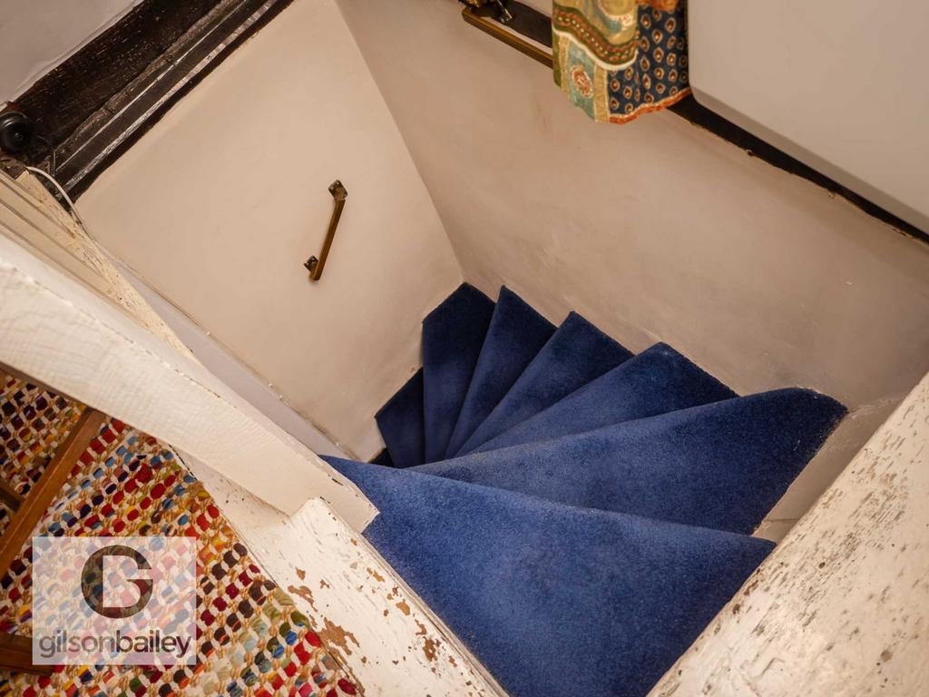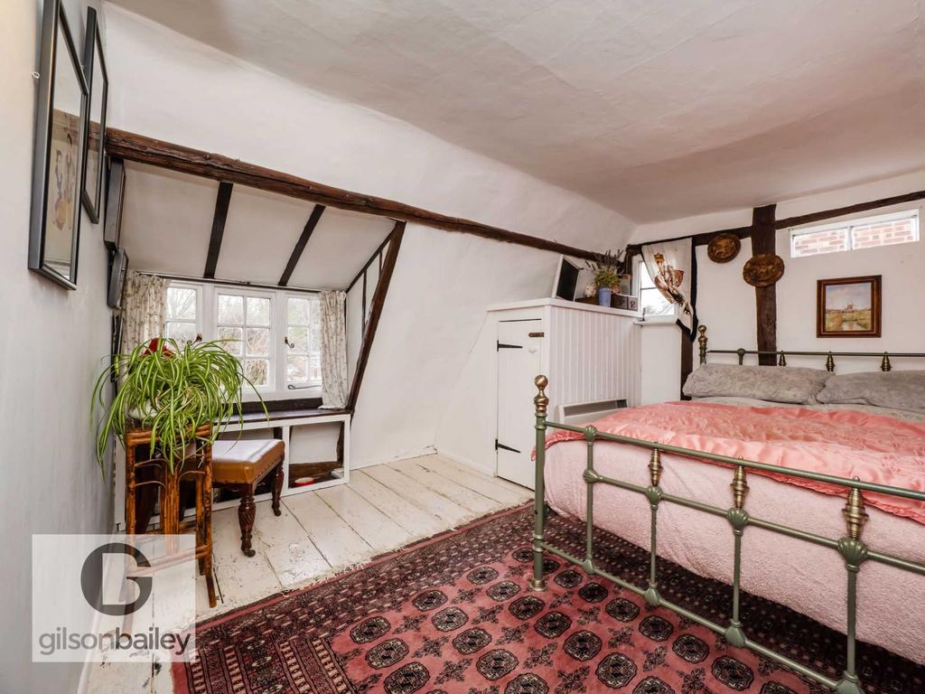 Glazed window to side x2, glazed window to front, wood flooring, exposed wood beams, radiator, storage cupboard.