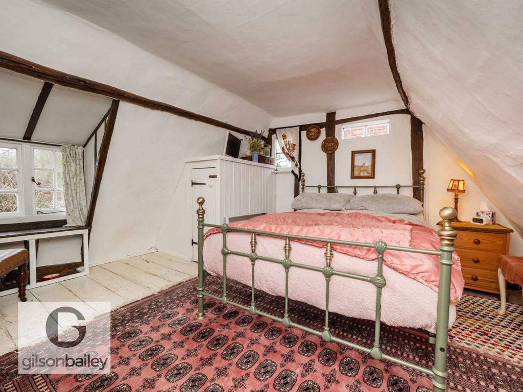 Secondary glazed window to rear, fitted carpet, radiator, exposed wood beams, door to bathroom, door to kitchen.