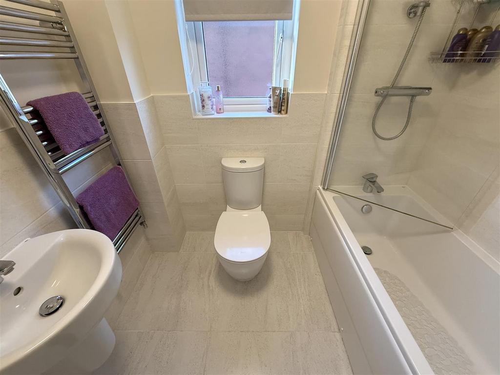 Family Bathroom - Fitted suite comprising panelled bath with shower over and screen to side, push button low level WC and wall mounted sink unit with mixer tap. Tiled flooring. Part tiled walls. uPVC double glazed window to side aspect. Chrome ladder style towel radiator.