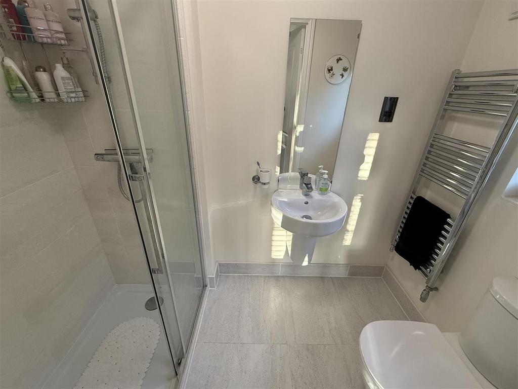 En-Suite - Fitted suite comprising; shower cubicle, push button low level WC and wall mounted sink unit with mixer tap. uPVC double glazed window to side aspect. Chrome ladder style towel radiator. Tiled flooring.
