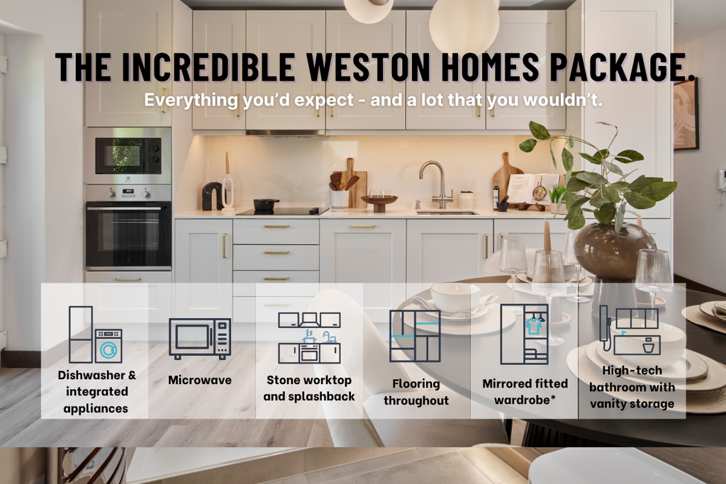 *Applies to new reservations for a limited time period on selected full market value plots only. Any agreed incentive will be applied as a one-time allowance at point of legal completion. All offers and incentives are subject to Weston Homes’ approval before reservation. †Journey times are taken from National Rail and Google and are approximate only. *Source: Home Builders Federation Watt A Save January 2025. Computer generated images are used for illustrative purposes only. Internal photography is of a typical Weston Homes show home and is indicative only. Speak to a Sales Consultant for further details. Specification may vary. Service charge has not yet been finalised. E&OE.