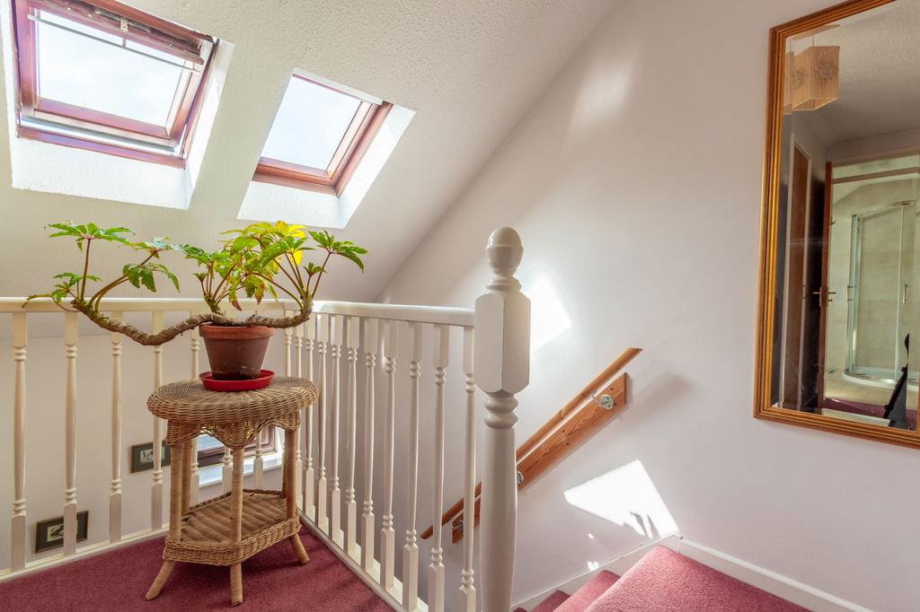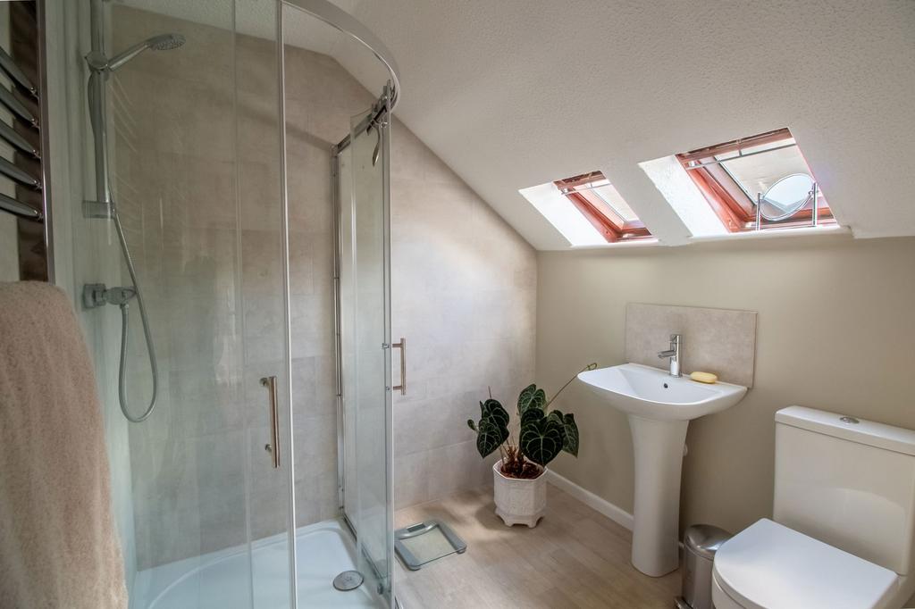 Upstairs, a single bedroom and a double bedroom open off a spacious bright landing. The double bedroom benefits from a generous range of built- in wardrobes, and both rooms have views over the rear garden. The recently refurbished shower room features a generously sized, stylish walk-in shower and is beautifully lit by the two south facing Velux-style windows. A good sized airing cupboard and under-eaves storage open off the landing.