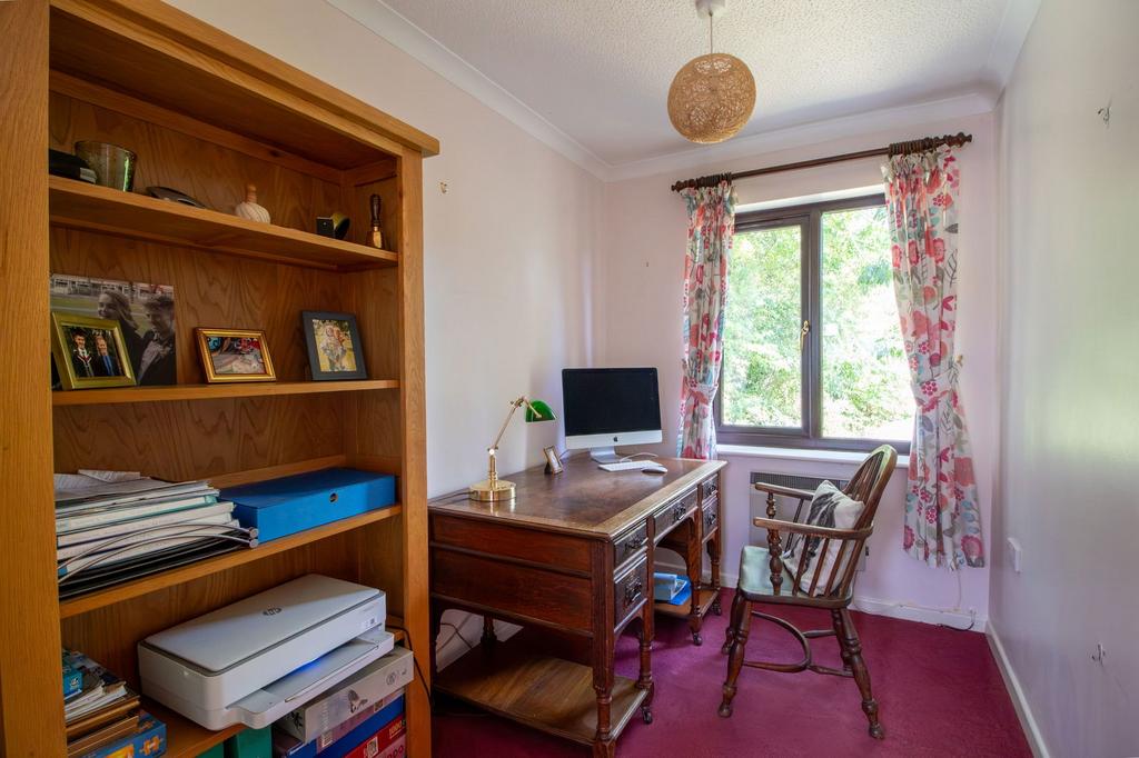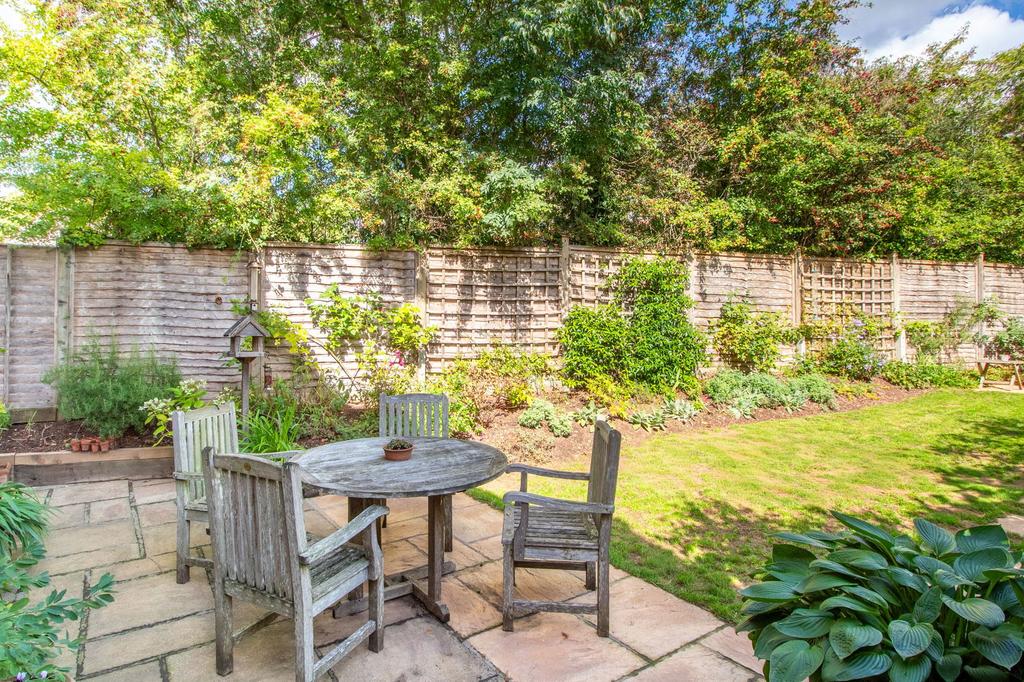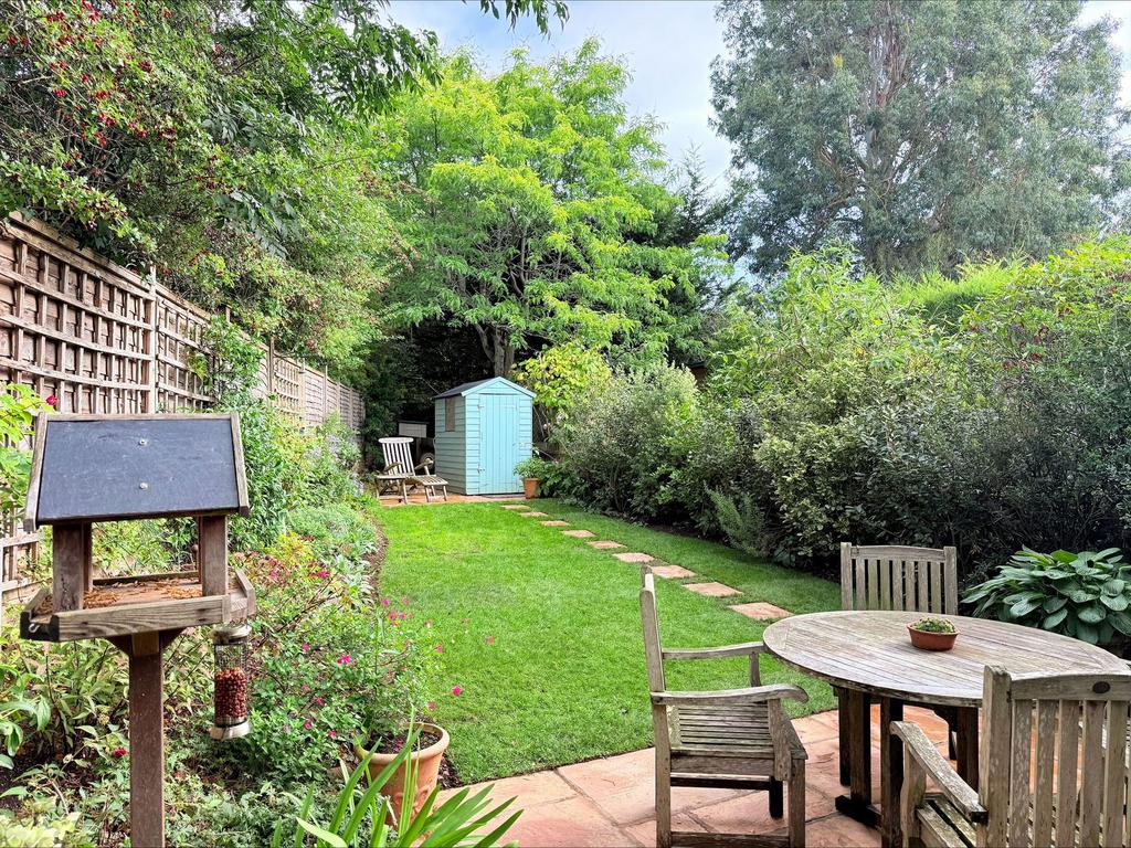 The garden is a delight. It is bordered to the north by beautiful mature trees, to one side by fencing and to the other by mature evergreen shrubs providing privacy throughout the year. Access from the sitting room is onto a generous paved area, allowing good space for a garden table and chairs. Stepping stones lead across the lawn to the very pretty, recently refurbished garden shed. The shed is surrounded by paving, providing a storage area to the rear and a seating area to the side from which to enjoy the afternoon sun. A border along the fenced boundary is planted with a variety of climbers and herbaceous plants providing interest and colour throughout the year. The recent redesign of the garden carried out by the current owner has afforded the property gated side access from the garden to the front of the property where a good sized hard-standing provides space for bins and recycling.