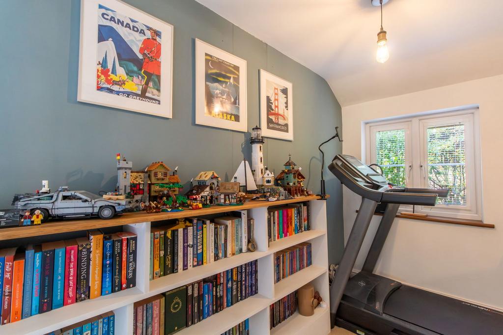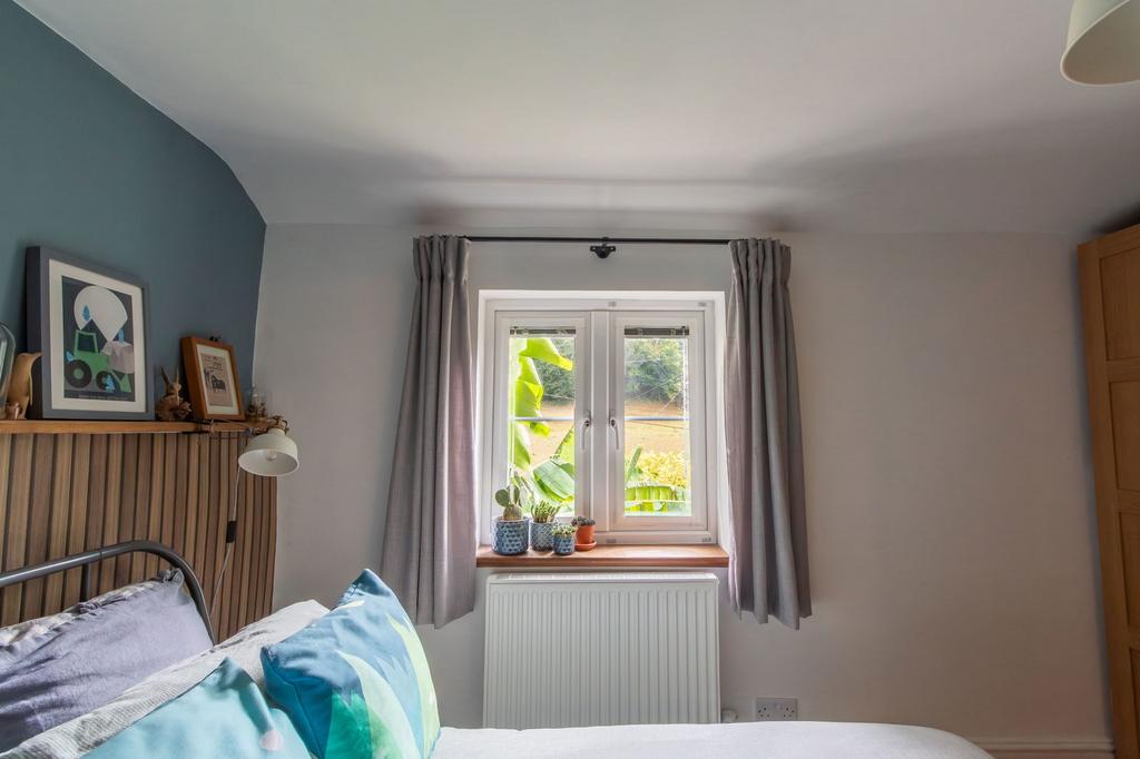 Upstairs, the principal bedroom is a generous double with views across The King’s Wood and Urchin Wood on Cleeve Hill, while the second bedroom is equally well presented and filled with natural light from the double aspect. A third room offers versatility as a study, home office, or occasional guest space, benefitting from the same charming outlook. The shower room has been finished to a high standard, with quality fittings, a large walk-in shower, built-in cabinetry, and a heated towel rail.