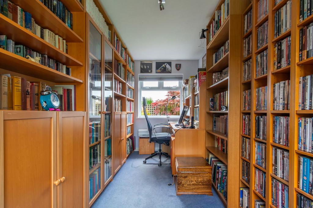 Adjoining the sitting room is a study, a particularly versatile space that can easily serve as a home office, reading nook, or craft room. This room also enjoys direct access to another section of the garden, allowing you to step straight outside — perfect on warmer days.