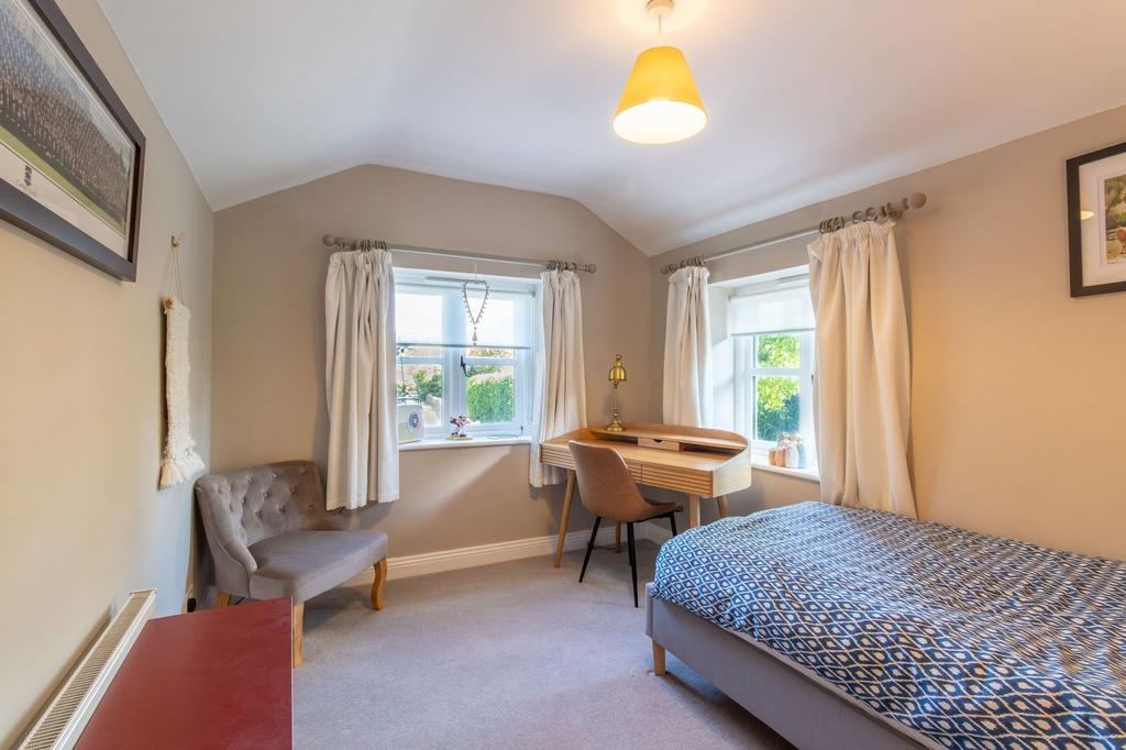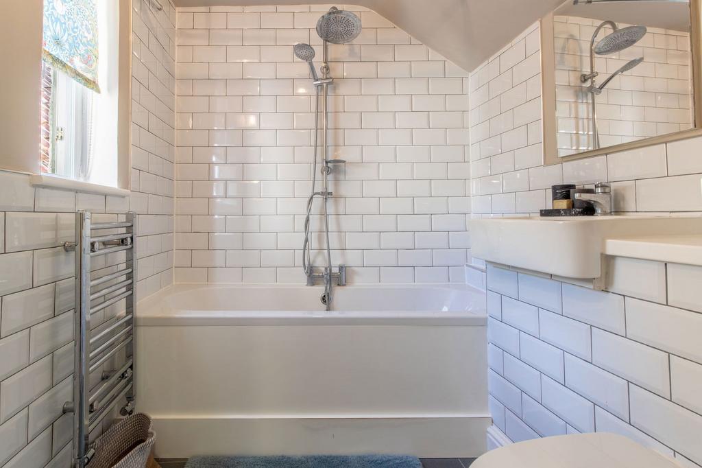Upstairs, all three bedrooms are generous doubles, each offering a comfortable, airy feel. The main bedroom benefits from built-in storage and a well-appointed en-suite bathroom, complete with a shower over the bath, a sink, and WC. The remaining two bedrooms are spacious and feature characterful details that add charm and individuality. A family bathroom serves these rooms, thoughtfully designed with a large walk-in shower, WC, and vanity storage, providing both style and practicality for everyday living.