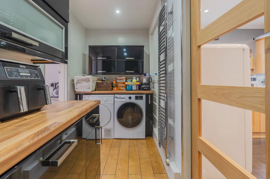 To the rear of the hallway is a great sized kitchen/dining room with plenty of space for a family sized dining table. The kitchen units have solid oak doors with stainless steel handles complemented by a granite worktop. A small breakfast bar offers space for informal dining and the kitchen features an integrated oven and hob, recessed sink with drainer and a smart ceramic tiled floor. A great sized utility room is just off the kitchen, with plumbing for white goods and more storage cupboards, and this leads through to another generous store room with a door to the garden, perfect space for a kennel or bed for those with dogs.