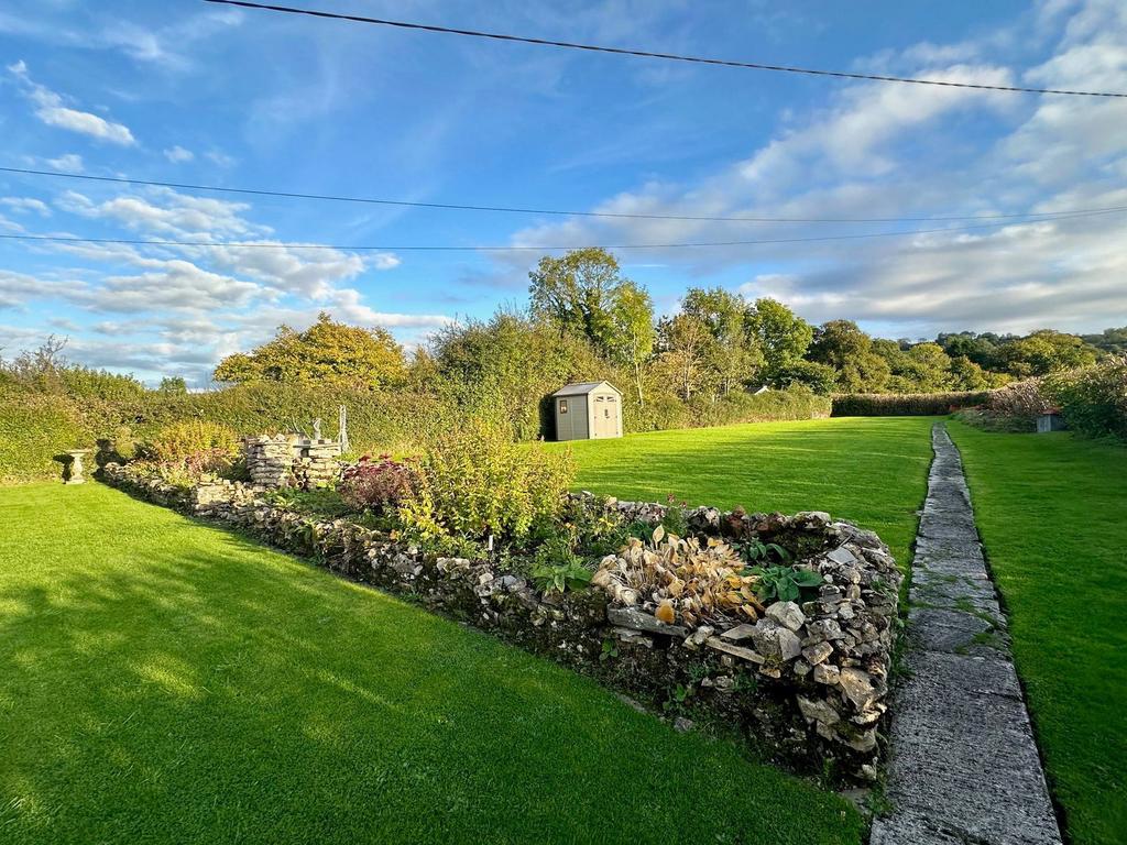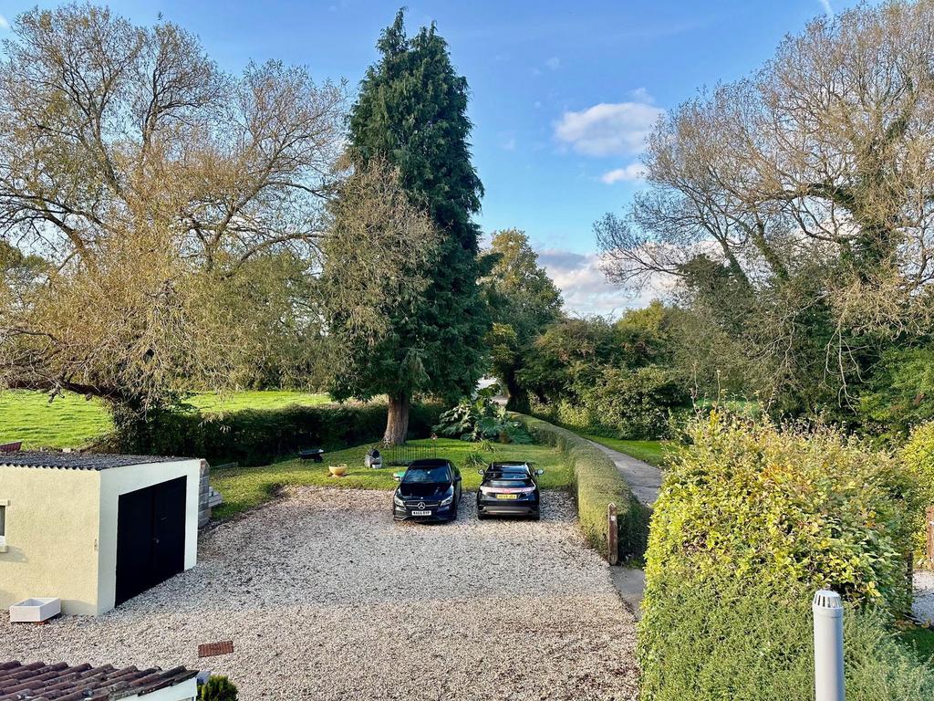 At the front of the house, a spacious gravel driveway offers ample parking for multiple vehicles, alongside a detached garage. The generous front garden is predominantly laid to lawn, featuring a variety of trees along the boundary and is enclosed by a field gate.