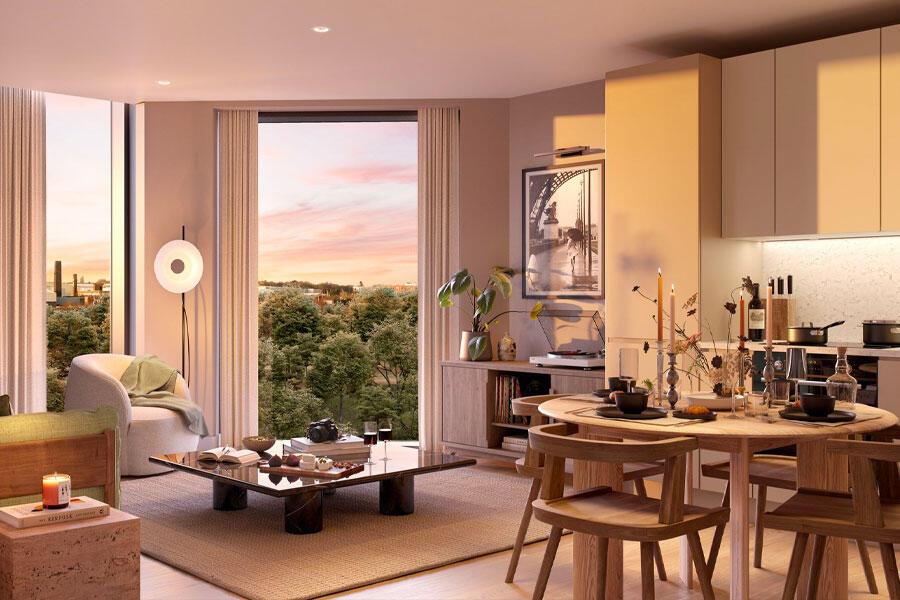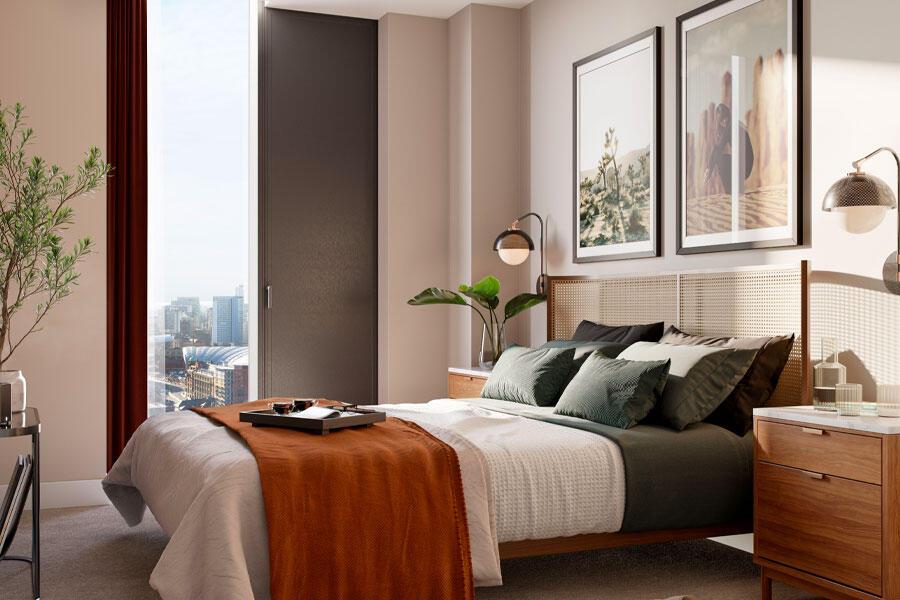 A sophisticated two-bedroom, two-bathroom apartment that blends modern architecture with natural surroundings in one of Manchester’s most transformative new districts. The open-plan living area features floor-to-ceiling picture windows framing the city skyline, complemented by a sleek fitted kitchen and premium finishes throughout.