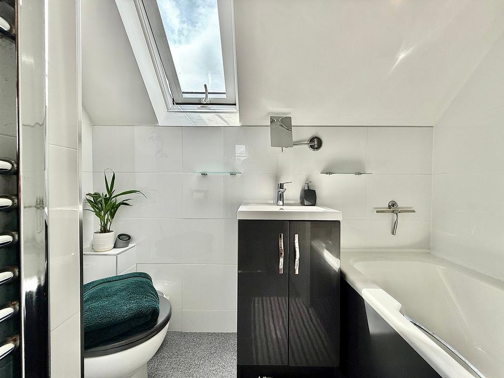 Bath, wash hand basin, low level wc, corner shower, double glazed Velux window.