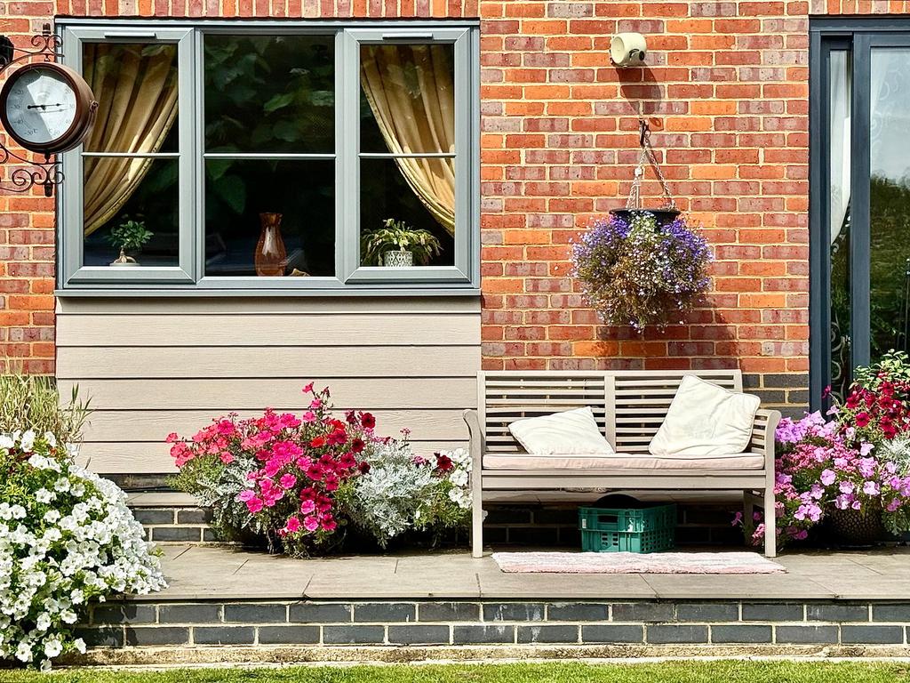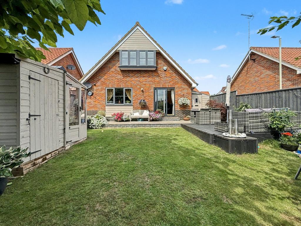 The rear garden is mainly laid to lawn with a composite decking area, porcelain tiled patio, and flower beds, enclosed by panelled fencing. X2 sheds and greenhouse to remain.