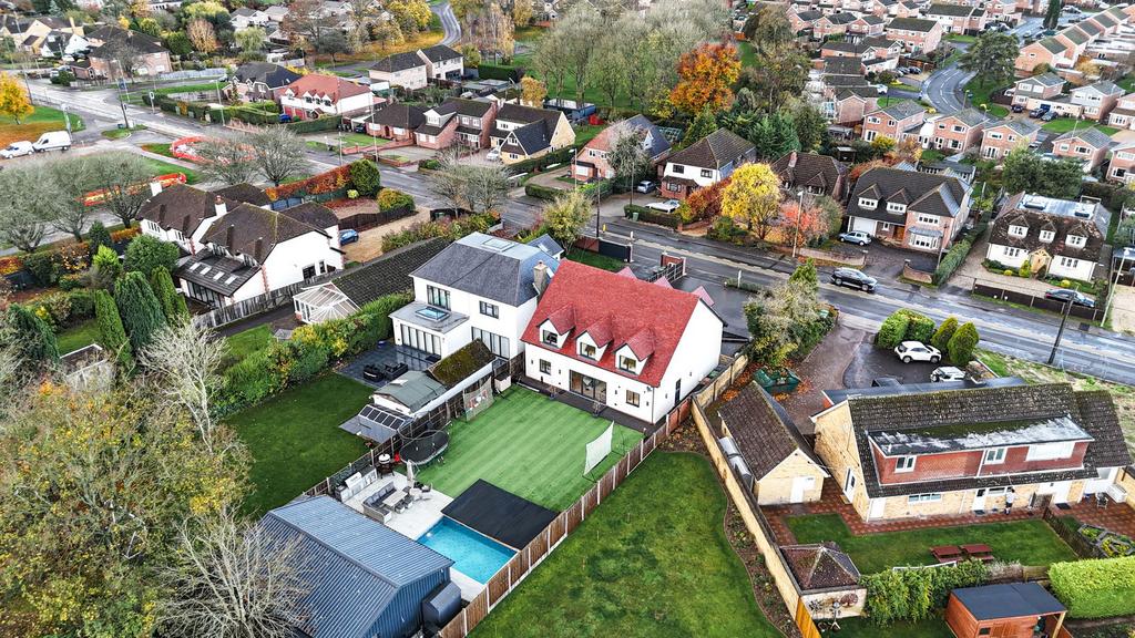 Bi-fold doors lead directly into the garden from the kitchen, leading onto an artificial lawn, keeping the outlook green in all seasons. A generously proportioned patio, ideal for unwinding or alfresco dining, adjoins the insulated, energy-efficient swimming pool, complete with air-source heating and a sliding cover. Set within the grounds, a detached cabin features a kitchen and bar, a spacious lounge, and two versatile rooms presently arranged as an office and a gym.