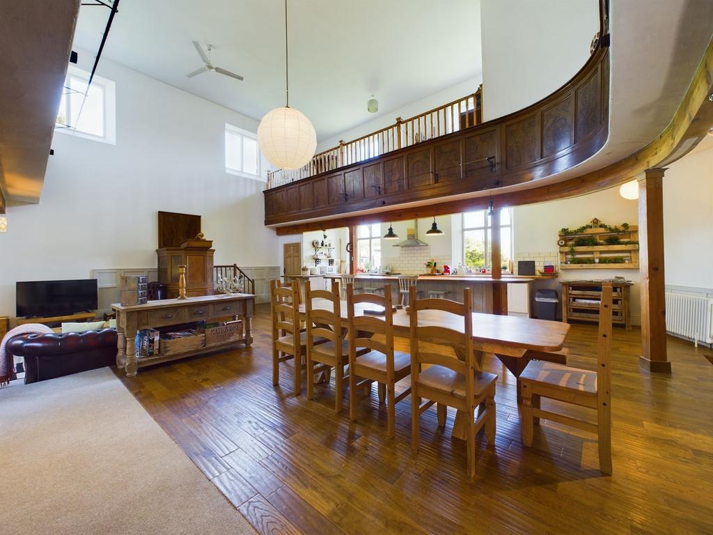 Stepping inside, the home immediately delivers the dramatic impact expected from a former church. At its heart lies a spectacular full-height central living space, where soaring ceilings, exposed beams and vast arched windows create a sense of scale and atmosphere that is truly breathtaking. Overlooking this majestic space is a mezzanine-style balcony, offering an additional living area, ideal as a reading retreat, snug or creative workspace,while celebrating the height and volume of the original structure.