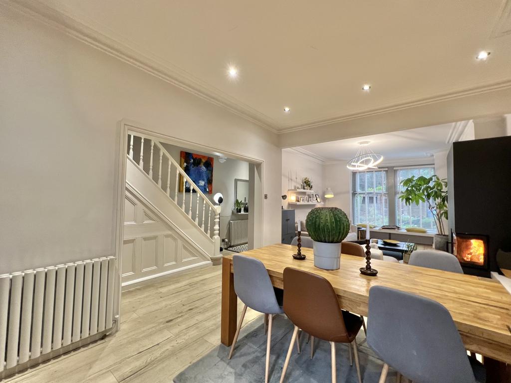 The ground floor boasts an impressive open-plan kitchen and dining area, complete with a stylish breakfast bar and a cosy log burner. The property offers three generous double bedrooms on the first floor, served by a modern four-piece family bathroom.