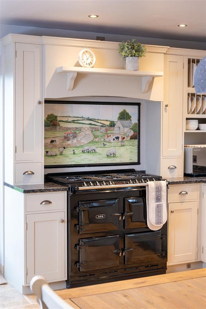 Kitchen - 6.9 x 4.2 (22'7" x 13'9") - With five double glazing windows to the front, glass door to the side for access and tiled flooring with underfloor heating. Featuring a variety of fitted wall and base units with granite worksurface over, two bowl Belfast sink with drainage and space for AGA with extractor fan over and feature tiled splashback. There is an integrated fridge and dishwasher along with ample space for a dining table and chairs and double doors lead through into the living room.