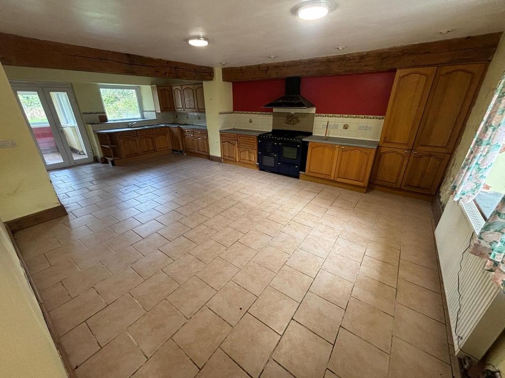 23' 4" x 15' 11" (7.11m x 4.85m) Full of character with exposed beams and farmhouse style kitchen, including a range of wall and floor units and worktop over, stainless steel sink and double drainer unit. Cooker point with an extractor fan over. Ceramic tiled flooring and double aspect windows. Patio doors leading to: