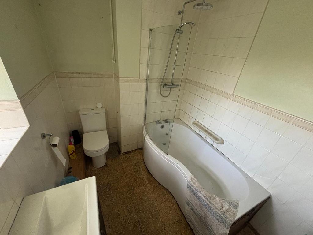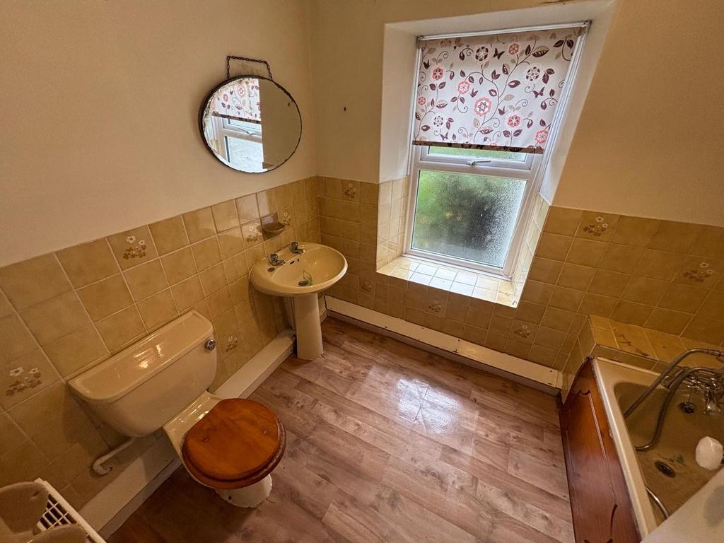 With tiled flooring and part tiles walls. Low level flush W.C., and a pedestal wash hand basin. Radiator.