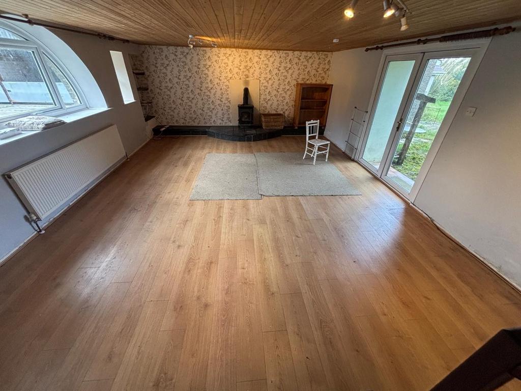 23' 4" x 16' 3" (7.11m x 4.95m) A large open room with multi fuel wood burner set on a slate hearth. Double aspect to the front and patio doors to the rear. Timber flooring and tongue and groove celling.