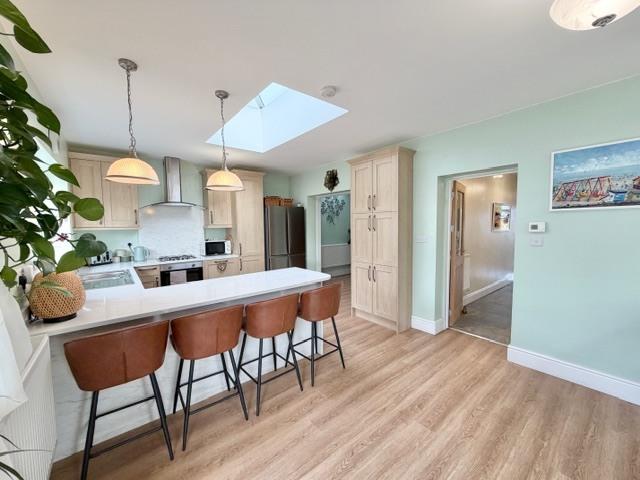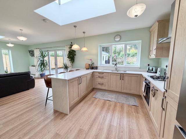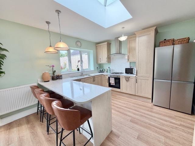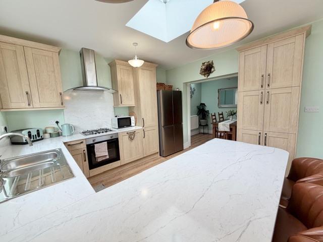Fitted laminate flooring. A range of wall and base units in a light oak style shaker with marble affect granite Worktops. Stainless steel sink and drainer with mixer tap. Electric oven, gas hob with extra extractor fan over. Integrated dishwasher. Power points. Central light fitting. UPVC double glazed roof Lantern. UPVC double glazed window overlooking enclosed rear garden.